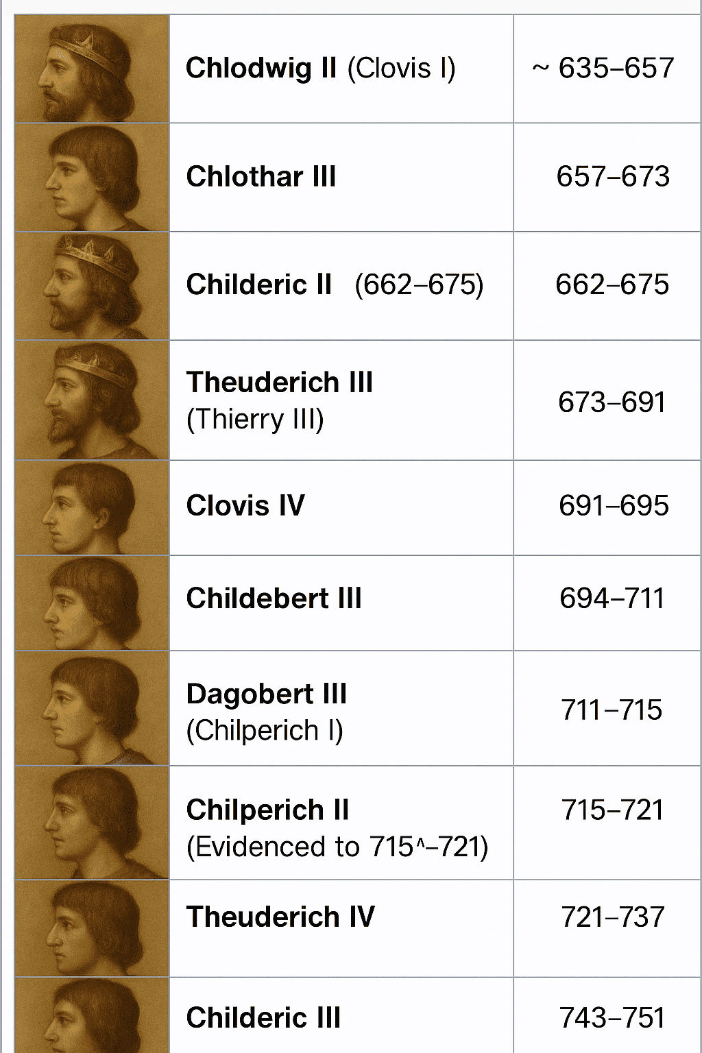 Перечень наиболее известных «ленивых королей» (поздние Меровинги)